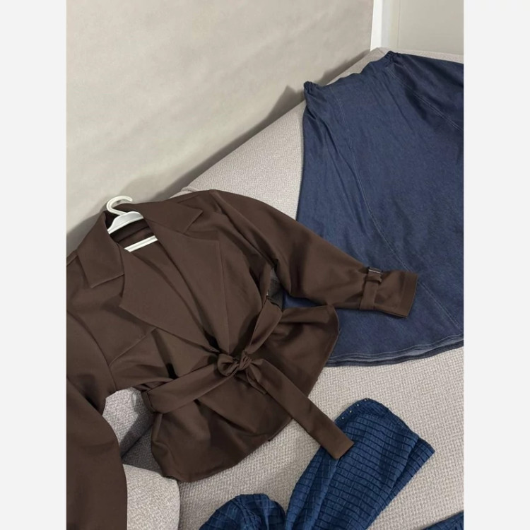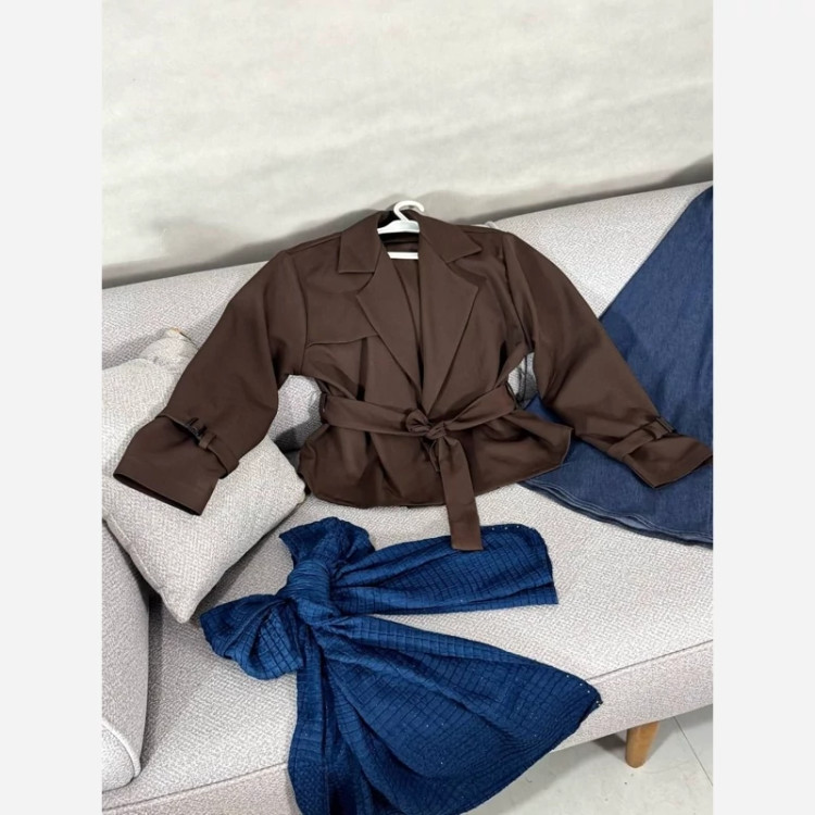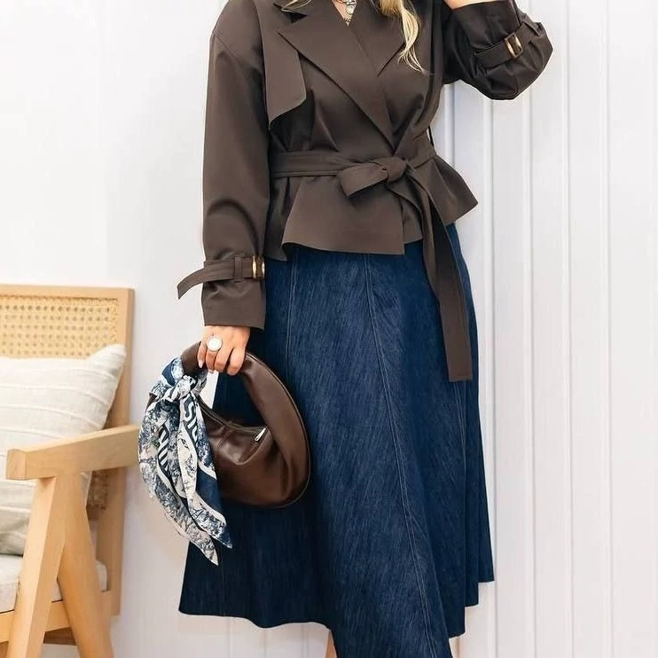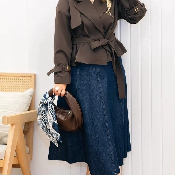 🧵جنس : جنس کت کرپ سوپر باربی درجه یک رنگ قهوهای سوخته ترندی/ دامن جین پنبه درجه یک