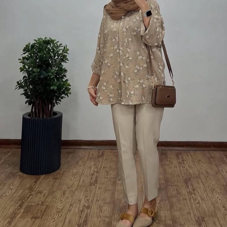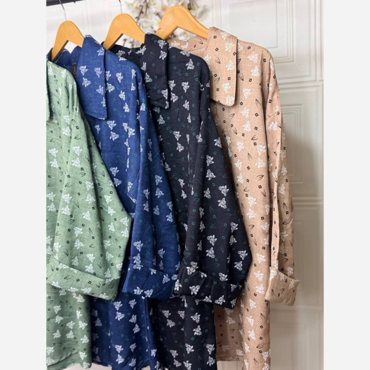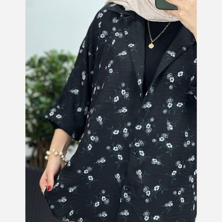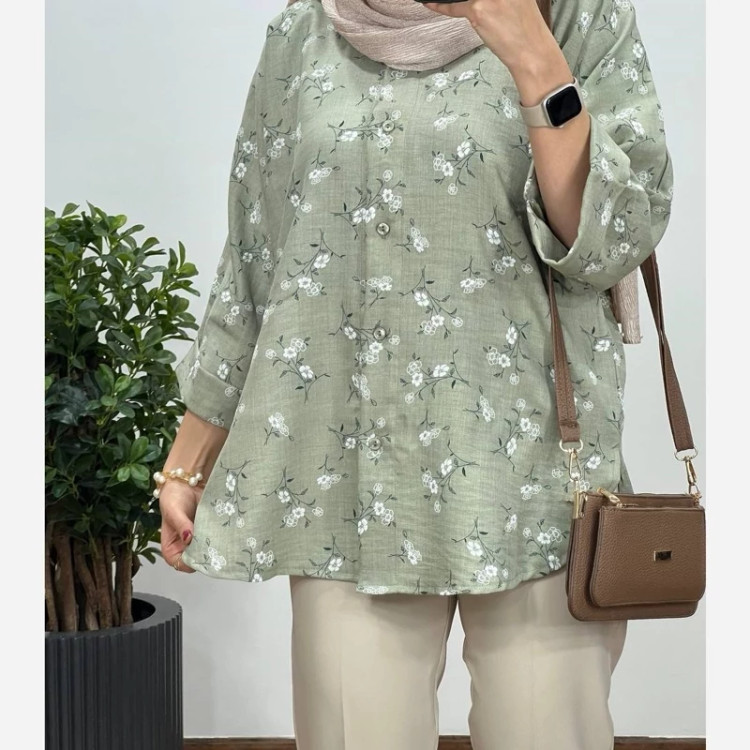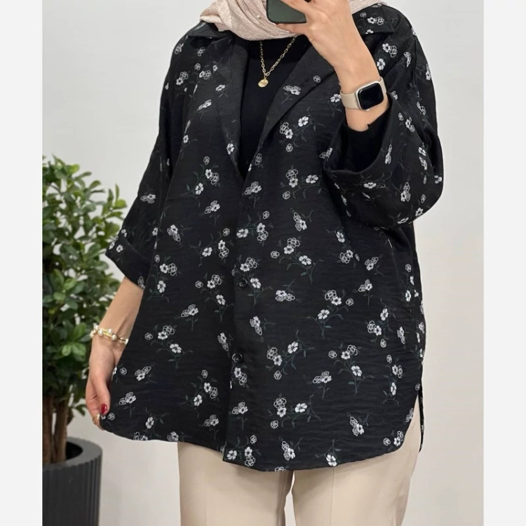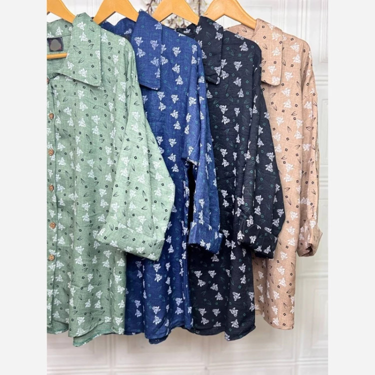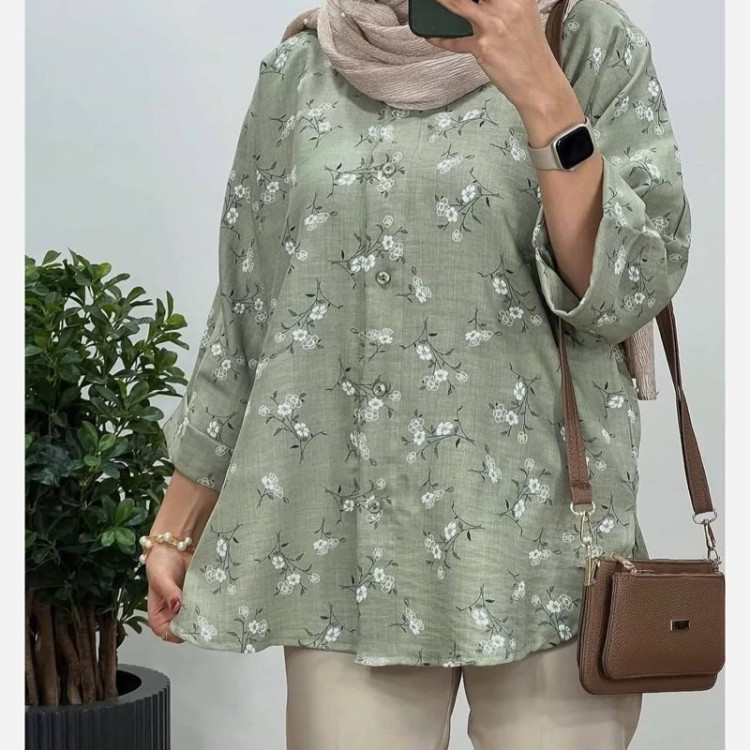 #️⃣شناسه کاربری : #3355 🖋نام : شومیز گلدار ملینا 👚جنس : لنین گچی 🌈رنگ بندی : مشکی , سورمعی , نسکافعی , سبز , 📏سایزها : فریسایز38تا46 , 📝توضیحات : قد حدود 75 ارسال فوری