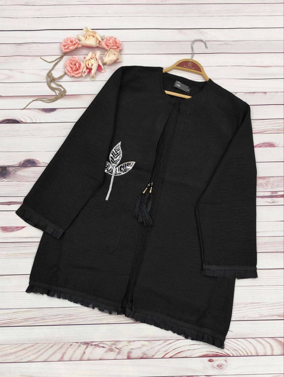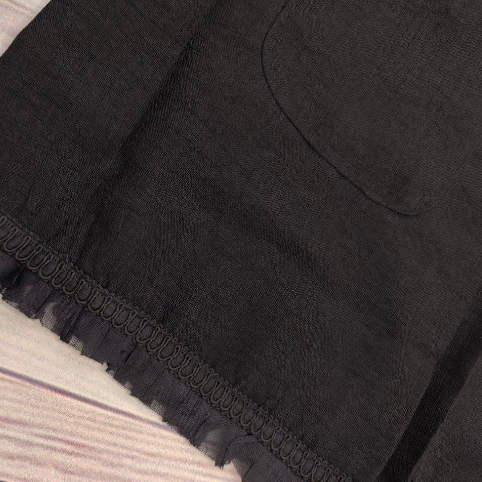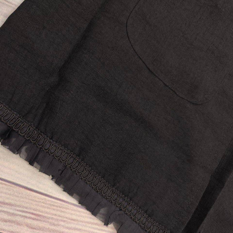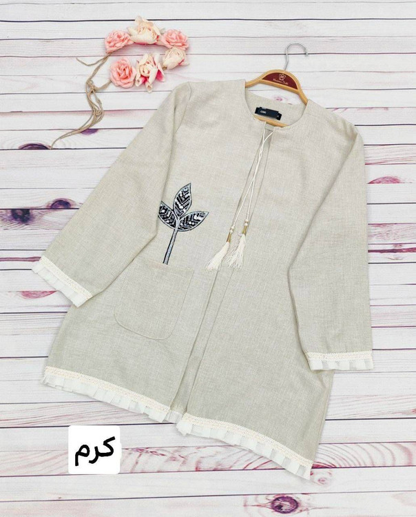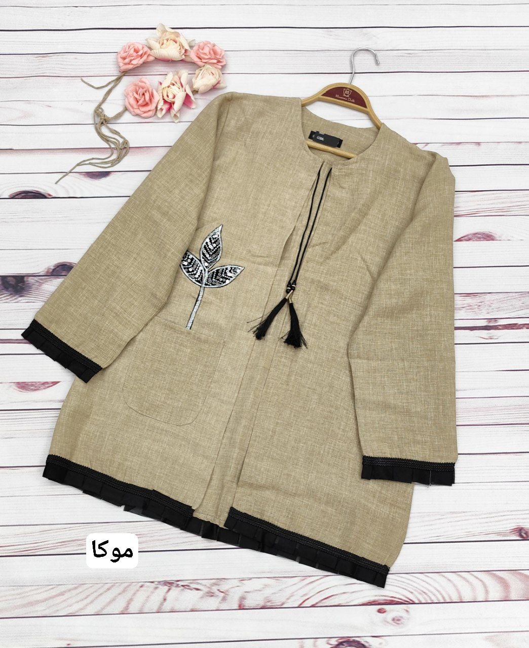 خرجکار نوار مکرومه و تور پلیسه پایین مانتو و سر آستینها دوخته شده