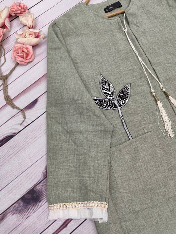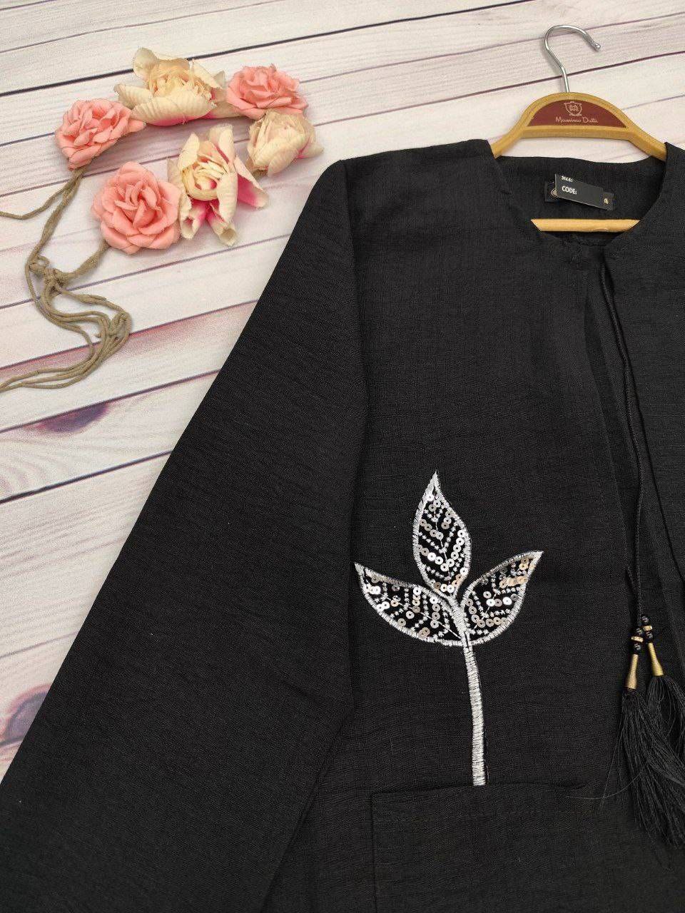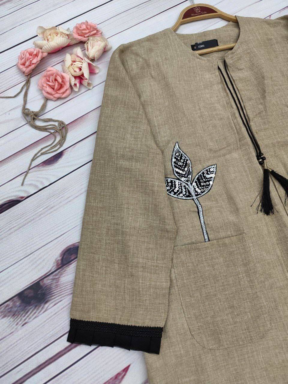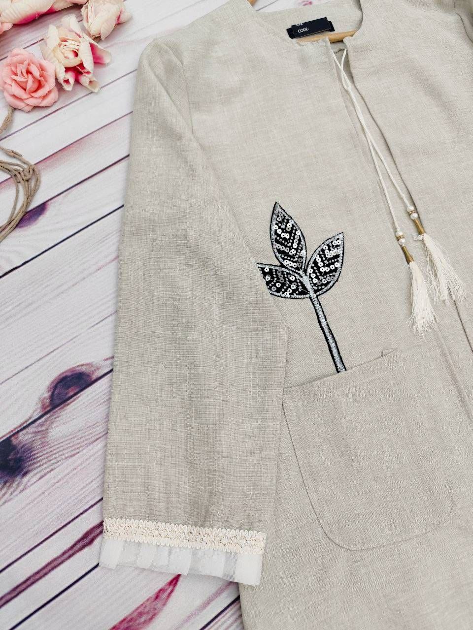 خرجکار نوار مکرومه و تور پلیسه پایین مانتو و سر آستینها دوخته شده